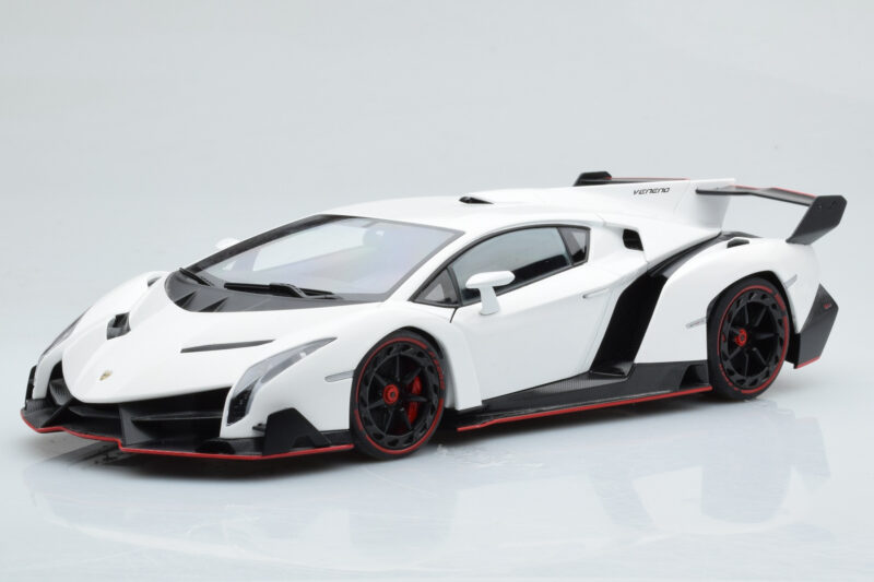 The Lamborghini Veneno Бял AUTOart 1:18 is crafted from Метал. Die-cast zinc alloy body with detailed plastic parts, rubber tires, and high-quality paint finish. Die-cast models are known for their weight, durability, and realistic feel.