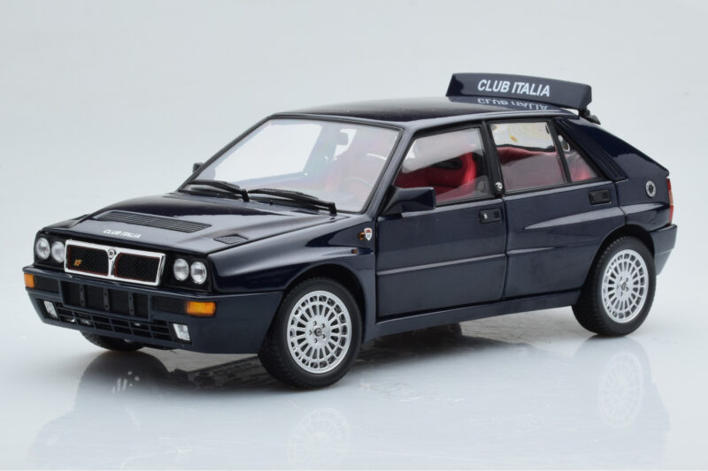 The Lancia Delta HF Integrale Club Italia Син Kyosho 1:18 is crafted from Метал. Die-cast zinc alloy body with detailed plastic parts, rubber tires, and high-quality paint finish. Die-cast models are known for their weight, durability, and realistic feel.