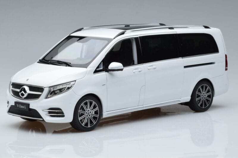The Mercedes V-Class W447 V260L Бял Mercedes 1:18 is crafted from Метал. Die-cast zinc alloy body with detailed plastic parts, rubber tires, and high-quality paint finish. Die-cast models are known for their weight, durability, and realistic feel.