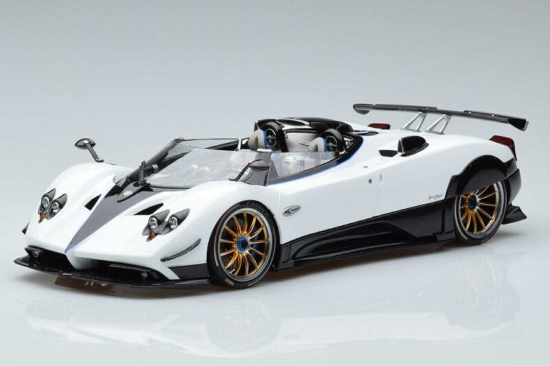 The Pagani Zonda HP Barchetta Carbon Fiber Бял LCD 1:18 is crafted from Метал. Die-cast zinc alloy body with detailed plastic parts, rubber tires, and high-quality paint finish. Die-cast models are known for their weight, durability, and realistic feel.