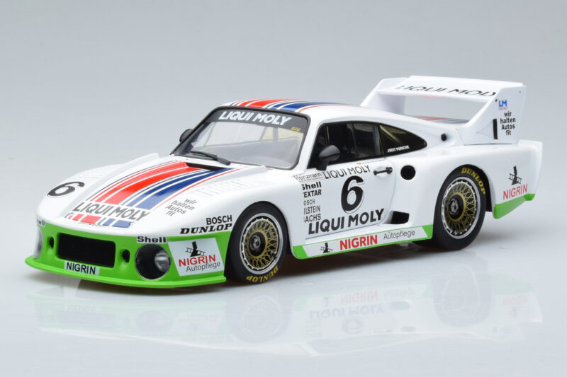 The Porsche 935J #6 Liqui Moly Spa-Francorchamps DRM 1980 MCG 1:18 is crafted from Метал. Die-cast zinc alloy body with detailed plastic parts, rubber tires, and high-quality paint finish. Die-cast models are known for their weight, durability, and realistic feel.