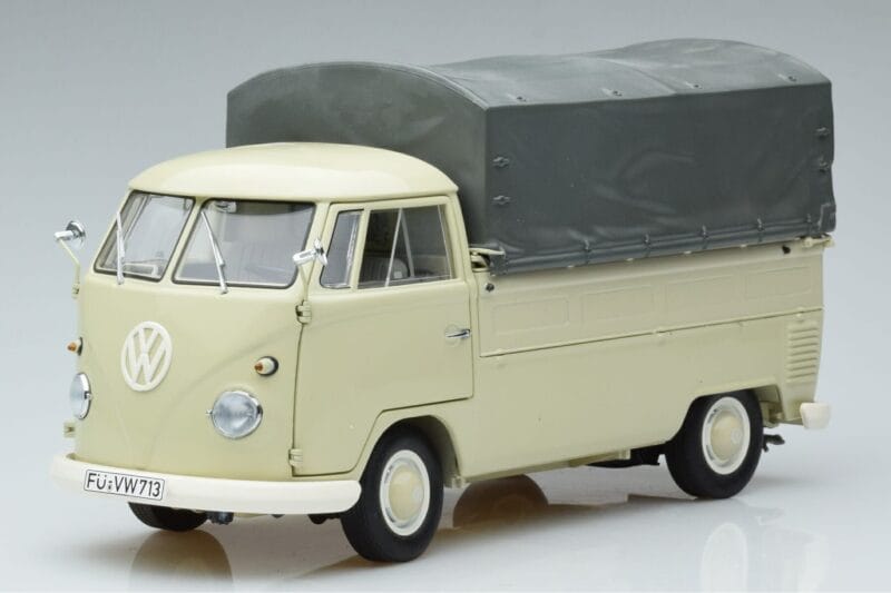 The Volkswagen T1b Pickup Schuco 1:18 is crafted from Метал. Die-cast zinc alloy body with detailed plastic parts, rubber tires, and high-quality paint finish. Die-cast models are known for their weight, durability, and realistic feel.