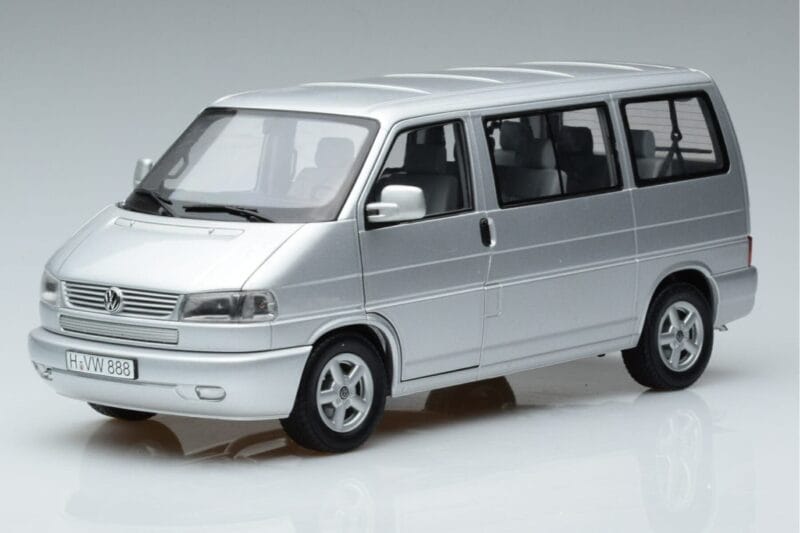 The Volkswagen T4b Transporter Caravelle Minibus Schuco 1:18 is crafted from Метал. Die-cast zinc alloy body with detailed plastic parts, rubber tires, and high-quality paint finish. Die-cast models are known for their weight, durability, and realistic feel.